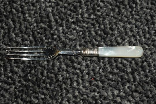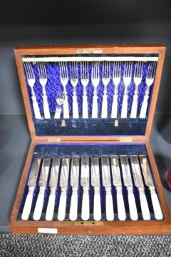 A set of 12 Victorian silver plated and mother of pearl fruit knives and forks, in an unmarked mahogany case, having decorated floral motifs upon the cutlery, 30.5cm, no key.
