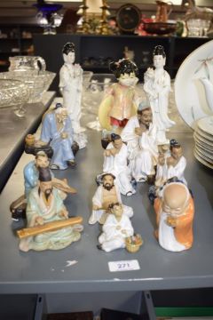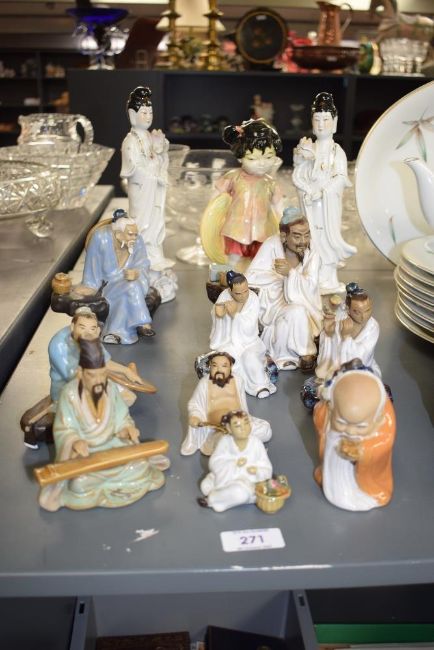 A selection of Chinese 'Mudmen' figures, sold together with two 20th century figures of Guanyin, and a Chinese child figure (af) some damages/missing parts to mudmen