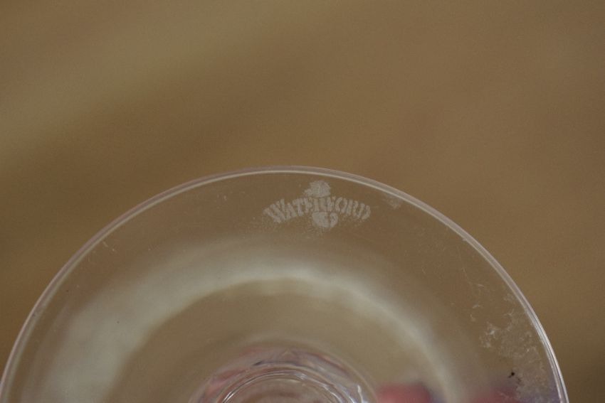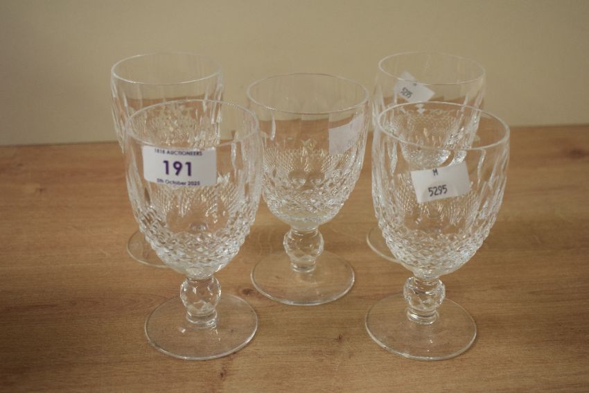 A set of 5 Waterford Crystal 'Colleen' claret wine glasses, each featuring a generously sized bowl, ornate cut-crystal design with intersecting broad and vertical cuts, and a distinctive short, bulbed stem, marked to base (5).
