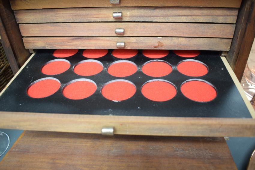 A 20th century stained wood coin/token collectors chest, having a fall-front enclosing ten drawers 25.5cm x 35.5cm x 26cm