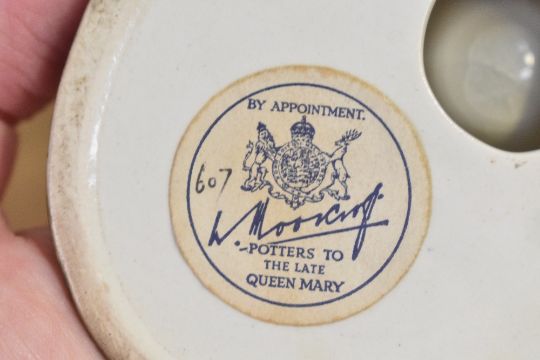 A collection of 20th century Moorcroft pottery, compromising of an Anenome design long neck bud vase and Ginger jar and one Coral Hibiscus patterened candle holder. All stamped Moorcroft and of floral decoration, ginger jar is missing its lid, the lip of the bud vase has noticeable repair (3 pieces).