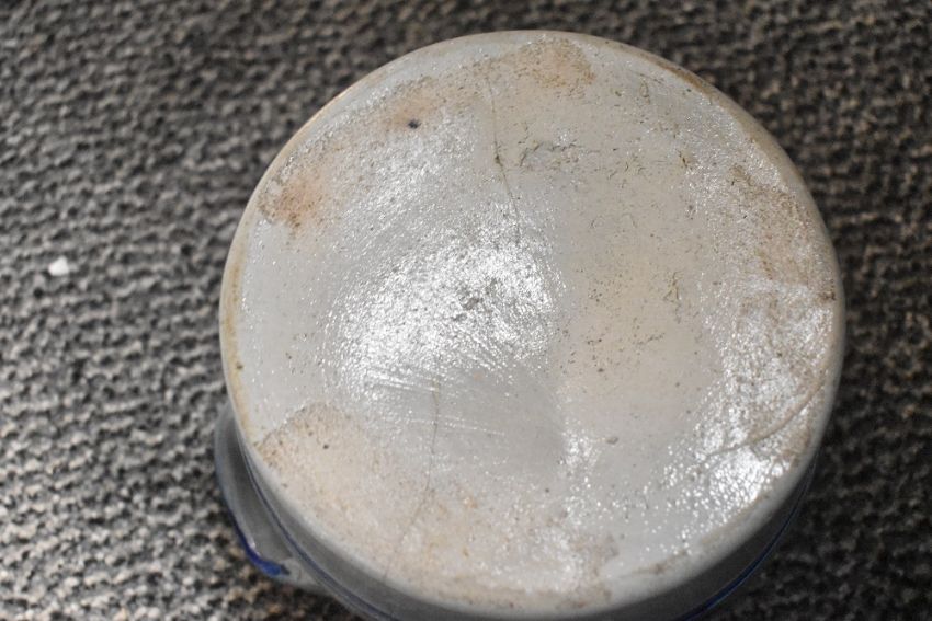 A selection of 20th-century German studio stoneware pottery, having an off white base, decorated in blue floral motifs with a salt-glaze finish. (6 items).