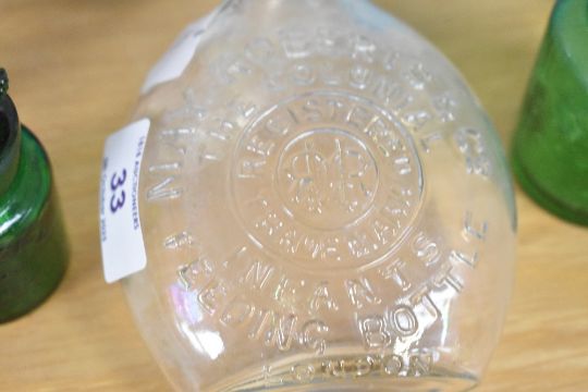 A selection of Victorian glassware, comprising two green glass bottles with stoppers by The Crown Perfumery, London; an infant feeding bottle by May Roberts & Company, London; an electric blue milk glass bottle; and four pressed glass tealight holders in shades of blue, green, and brown, (8).
