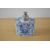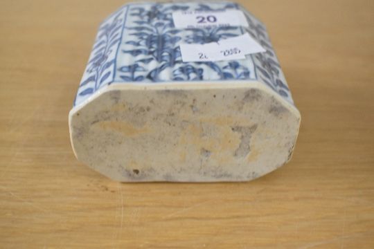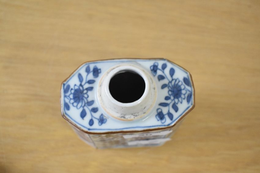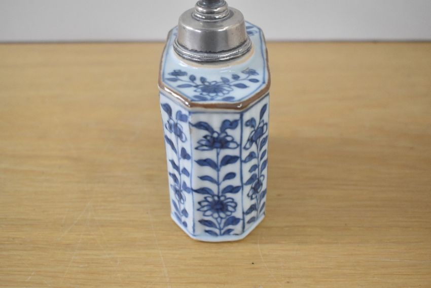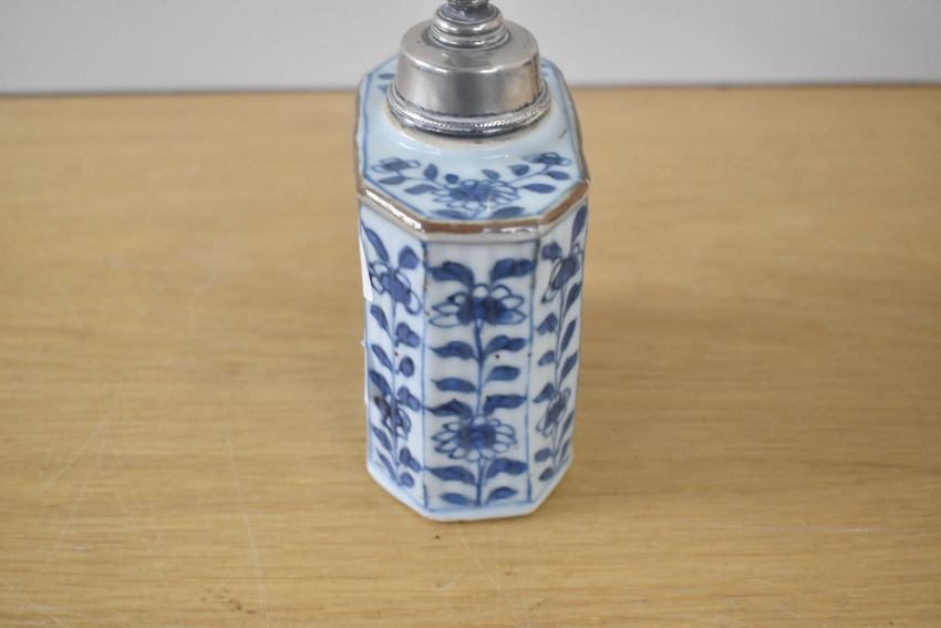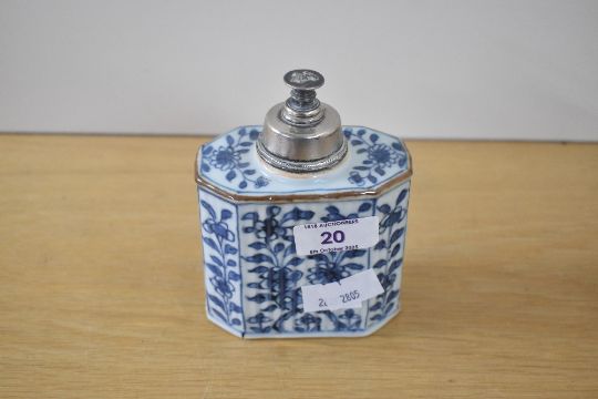 A Chinese porcelain rectangular decorative tea caddy, believed to be from the 18th-century Kangxi period, featuring a white metal lid with finial, an unglazed cylindrical mouth with a dark brown-edged rim, canted corners, and a ribbed blue and white floral body, 10.5cm.