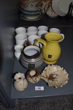 A quantity of local pottery, to include Kendal studio pottery, 4 plus 2 coronation mugs QE11, small jug and bowl all having eagle trade mark..*Pottery ran from 1952-95 and was fouded by Hubert Peter Aindow alongside brother Charles, Robert and Andrew. The Kestral workshop pottery appears to be Keith Hantley..