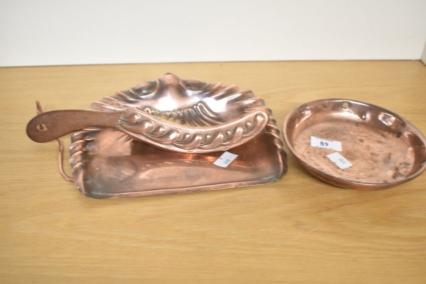 A Victorian, Birmingham, Joseph Sankey & Son, impressed copper, Art Nouveau style table brush and crumb-tray, sold with a small copper dish, (3).