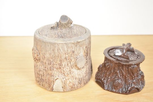 Two late 20th-century tobacco jars, both featuring a log finial and tree stump textured design, both with an earthy, natural finish (2 items).