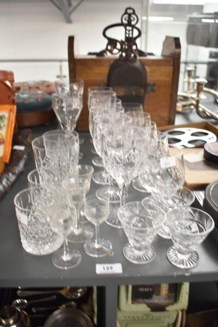 A collection of 24 crystal-cut and cut glassware pieces, including wine glasses, tumblers, and goblets. Some show signs of rim damage, (24).