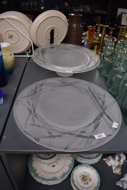 A modern etched glass plate with striped design, sold together with a pedestal bowl of conforming design 40.5cm & 34cm