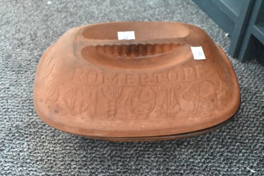 A large 20th-century West German Romertopf decorated clay pot with lid, sold with three natural clay traditional Moroccan tagine pots (4 items).