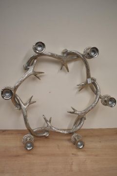 A decorative white metal multi-sconce table top candle holder, formed as a ring of entwined antlers, with six raised sconces, 54cm