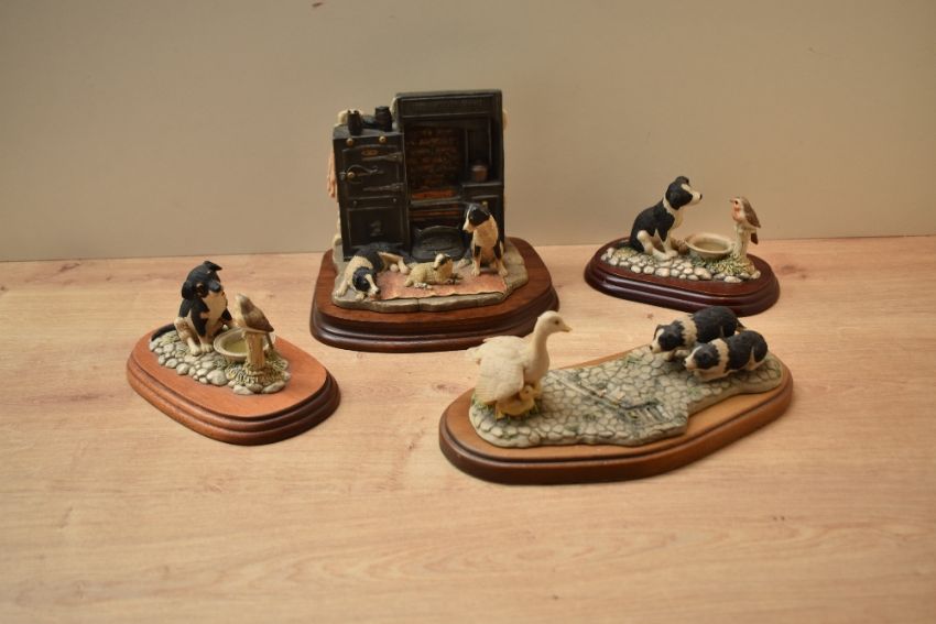 Four Border Fine Arts animal groups to include 'First Lesson' model number JH38 designed by D Walton and 'Puppy and Robin' FE16 designed by Ray Ayres, all complete with boxes etc.