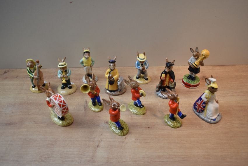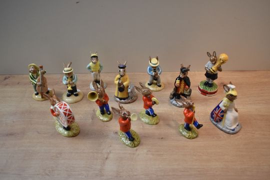 A group of thirteen Royal Doulton bone china Bunnykins characters to include five members of the 'Oompah Band' and limited edition 'Bunnykins Winners Trophy 2006' DB409 limited edition number 154/1000 etc.