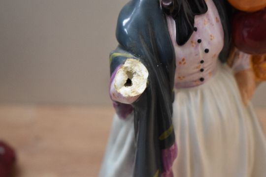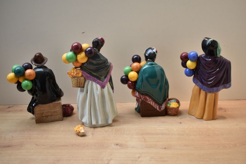 A group of four Royal Doulton bone china figures/figurines comprising 'Balloon Lady' HN 2935, 'The Balloon Man' HN 1954, 'The Old Balloon Seller' HN 1315 and 'Biddy PennyFarthing' HN 1843 (Damaged).