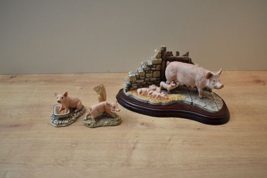 A Border Fine Arts animal group 'Last to Finish' model number B0011 designed by Kirsty Riley sold together with two smaller Border Fine Arts pig studies, all boxed.