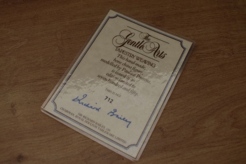 A Royal Doulton bone china limited edition The Gentle Arts series figurine 'Tapestry Weaving' HN 3048, limited edition number 712/750, designed by Pauline Parsons complete with certificate of authenticity and box.