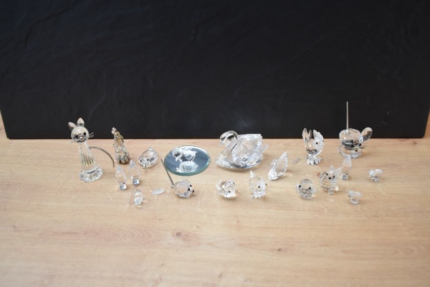 A group of Swarovski Crystal glass animal studies including mouse, swan and cockerel etc. Damage to cockerel