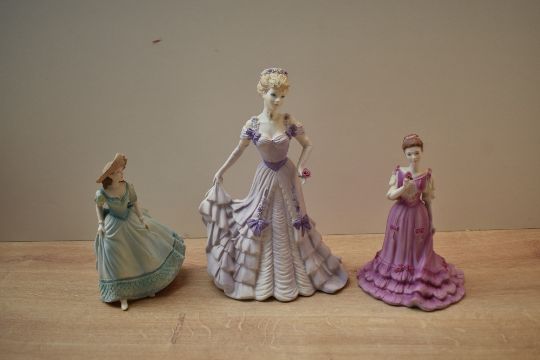 A group of three Coalport porcelain figurines to include Figurine of the Year 2008 'Beau Monde Isobel' etc.