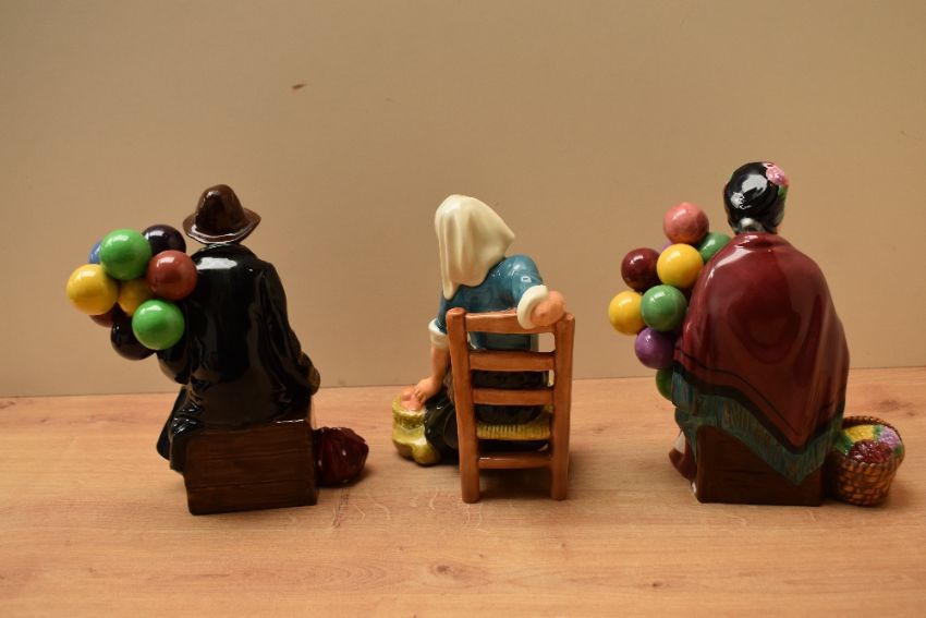 A group of three Royal Doulton bone china figures/figurines comprising 'The Apple Maid' HN 2160, 'The Balloon Man' HN 1954 and 'The Old Balloon Seller' HN 3737 a 1999 Michael Doulton special edition in celebration of 70 years AF.