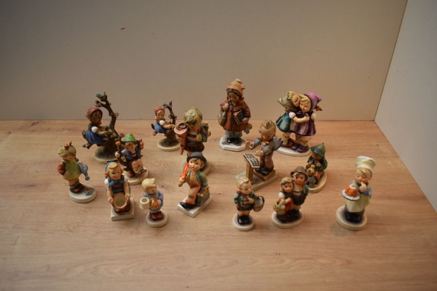 A selection of fifteen Goebel porcelain figures and figurines to include 'Little Gardener' model number 74, 'Apple Tree Boy' model number 142 and 'The Bandleader' model number 129 etc.