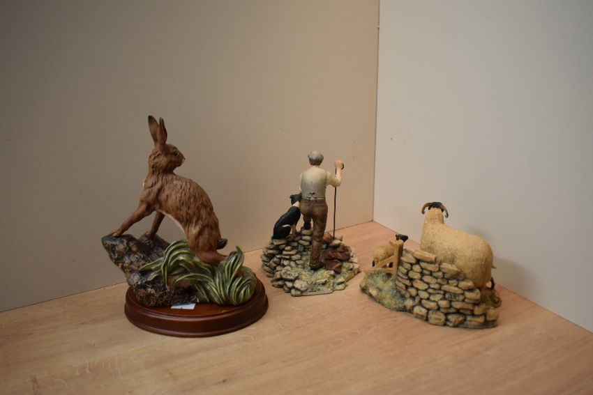 A Border Fine Arts animal group 'Spring Lambing' model number JH6 designed by Ray Ayres (missing ears), sold together with a Border Fine Arts figure group 'Time For Reflection' JH19 designed by Ray Ayres and a Royal Doulton The Wildlife Collection 'Hare' model number DA 6.