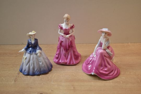 A Royal Doulton bone china figurine 'Sweet Poetry' HN 4133 complete with box sold alongside a Royal Doulton bone china Miniature Ladies Series figurine 'Ninette' M206 as well as four Coalport bone china figurines 'Beverley' complete with box, 'Minuettes Jodie', 'Debutante Dawn' and 'Debutantes In Love'.