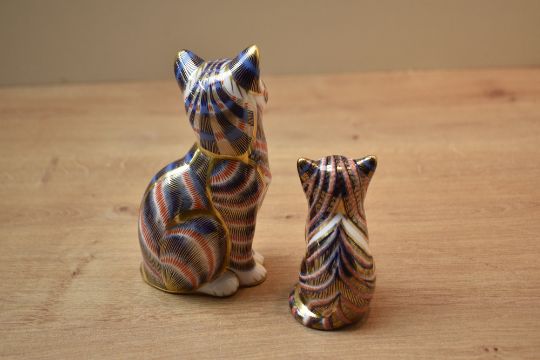 Royal Crown Derby bone china Imari Cat and Kitten paperweights both having Imari style decoration and gold coloured stoppers.