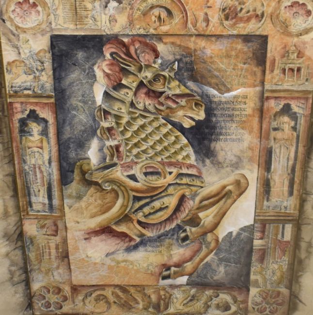 Sharon Whitehurst (American contemporary) colourful mixed media 'Age of Pageantry I' depicting an armoured rearing horse within classical architectural forms and vignettes, signed and entitled in gold coloured ink, mounted and within moulded and frame, under glass 79cm x 58cm & 104cm x 84cm overall slipped within frame.