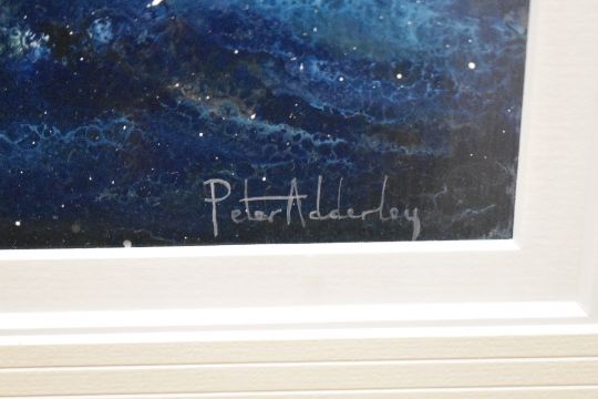 Peter Adderley (British b.1965) acrylics, a stylised interpretation of a boat and dog in stormy seas, with a lighthouse and on looking black cat, signed lower right, within a stepped and incised white card mount and modern black frame, under glass 41cm x 25cm & 71cm x 55cm overall.