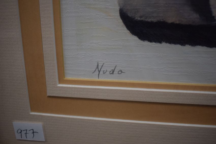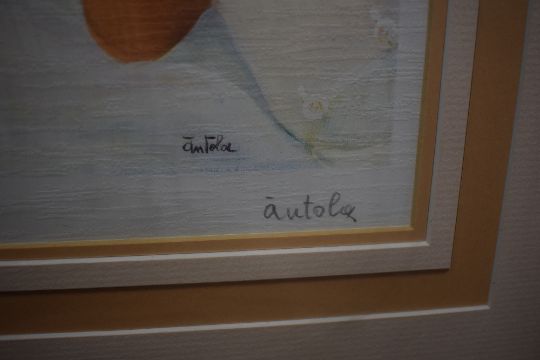 After Anna Antola (b.1930) colour print 'Nudo' depicting a partially exposed female sleeping next to a cat, signed and entitled in pencil to margin, within a stepped card mount and moulded frame, under glass 26.5cm x 36cm & 49.5cm x 58.5cm overall.