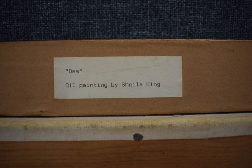 Sheila King (British contemporary) Oil on canvas, 'Des' traditional portrait of a brown spaniel on olive background, signed lower right, titled verso, within a moulded frame, 50cm x 39cm & 61cm x 50cm overall, some marks to canvas.