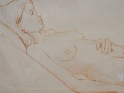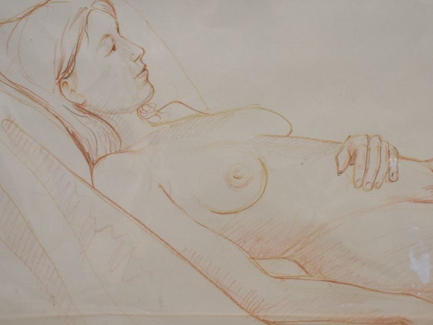 Gordon Grundy (British Contemporary) Graphite and coloured pencil, four female life studies, the first untitled a nude woman lounging on a chair, signed lower right, in a card mount, 39.5cm x 29.5cm & 50.5cm x 40.5cm overall, 'Angela Sleeping' a nude woman asleep on her front, signed and dated (2018) lower right, within a stepped card mount, 30cm x 37cm & 44cm x 50cm overall, 'Life Study' a nude woman lying down, signed lower left, in card mount 40cm x 30cm & 51cm x 40.5cm overall, lastly 'Young Girl Sleeping' a nude woman asleep on her front, signed and dated (2010) lower left, within stepped card mount, 40cm x 40cm & 50.5cm x 40.5cm overall