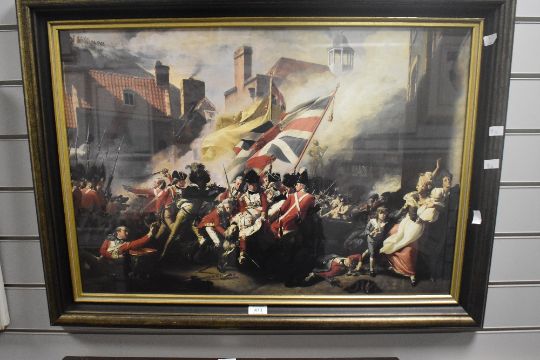 After John Singleton Copley (American 1738-1815) colour print 'The Death of Major Peirson' within a modern moulded frame, under glass 50cm x 72cm & 63cm x 86cm overall.