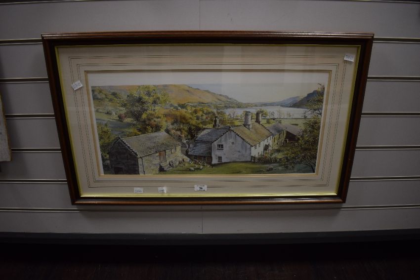 *Local Interest* Graham Carver (British Contemporary) print, quintessential Lake District scene depicting sheep grazing near farmers cottages, signature lower right, in stepped washline mount and moulded gilt and wood frame, under glass 61.5cm x 29.5cm & 82.5cm x 49.5cm overall, print has slipped in mount obscuring potential limited edition number, signature and title.