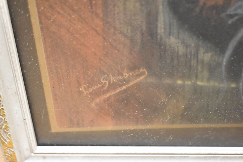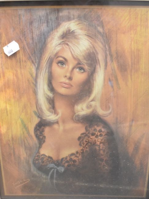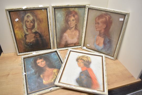 Lou Shabner (British 1917 - 1981) Lithograph 'Lucille' a portrait of a young lady in golden tones, attributed with title to lower right, mounted to a wood veneer backboard and within white and gilt moulded frame, under glass 27.5cm x 35cm & 33.5cm x 42cm overall, sold along with four other portrait prints by the same artist 'Hazel' 'Teresa' 'Helen' and 'Yvonne'.