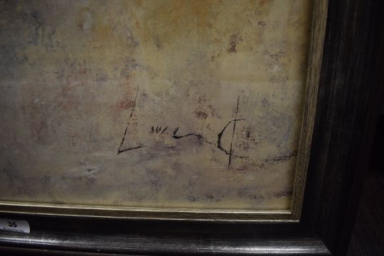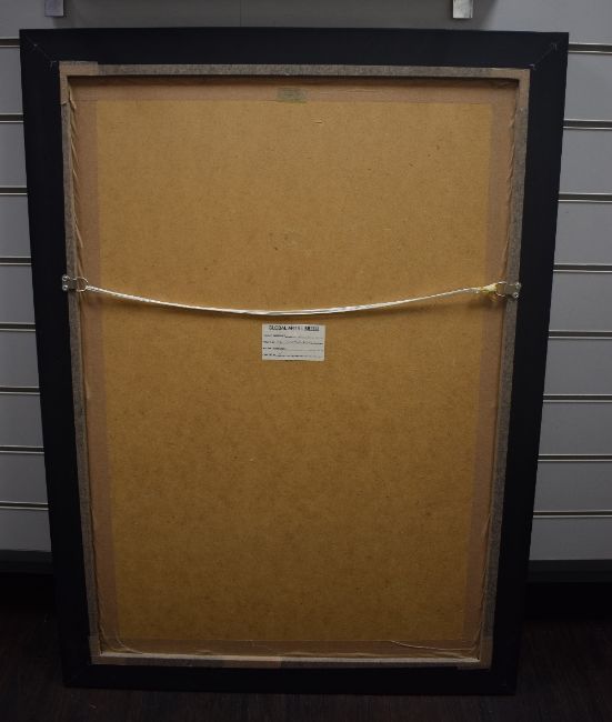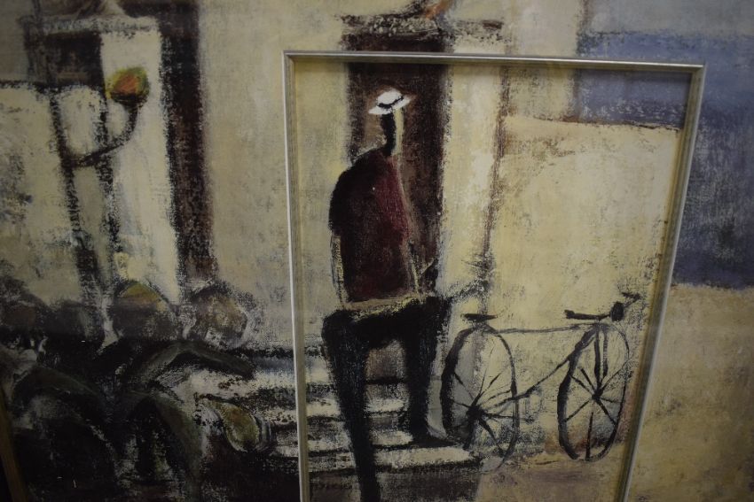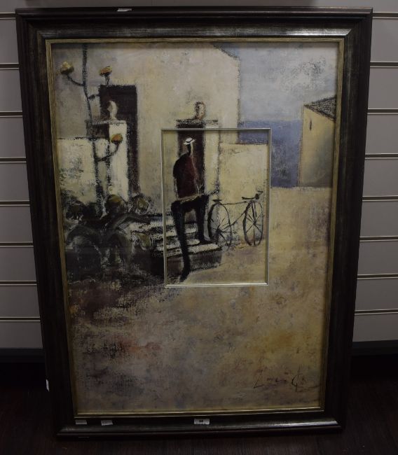 After Didier Lourenco (Spanish 1968-2023) decorative colour print 'El Descanso' the figure and bicycle recessed with silvered slip, the remaining image acting as the mount, within a moulded and stained frame, under glass 83.5cm x 56cm & 97.5cm x 69.5cm overall.