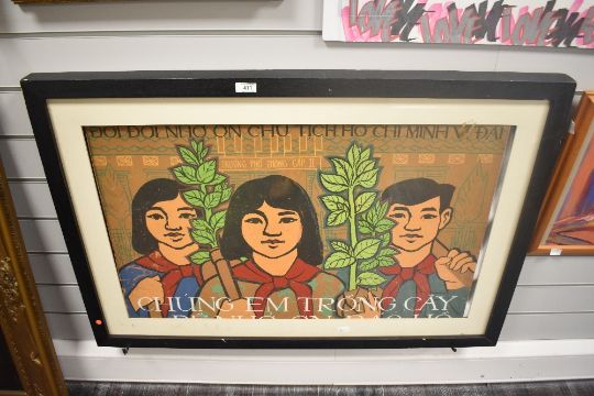 An unusual and interesting Vietnamese hand painted board propaganda 'poster ' featuring three youngsters planting trees outside a secondary school in remembrance of President Ho Chi Minh, within an associated card mount and stained frame, under glass/perspex 66cm x 96cm overall.