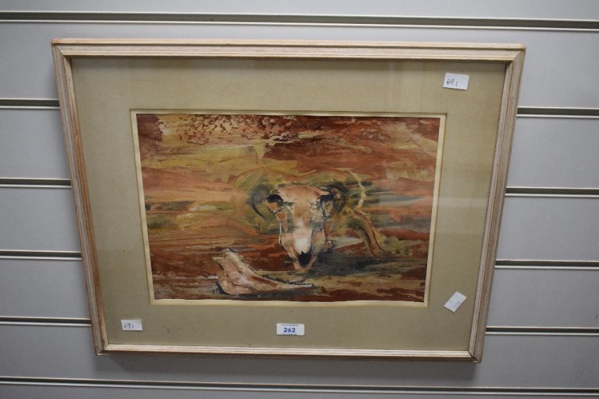 David Clyde Dridan (Australian b.1932) gouache, sheep skull within an abstract surround, signed in pencil lower right, artists label verso, within a stepped card mount and moulded frame, under glass 24.5cm x 34cm & 42cm x 51cm overall. Some discolouration to mount and slight joint separation to frames lower right corner