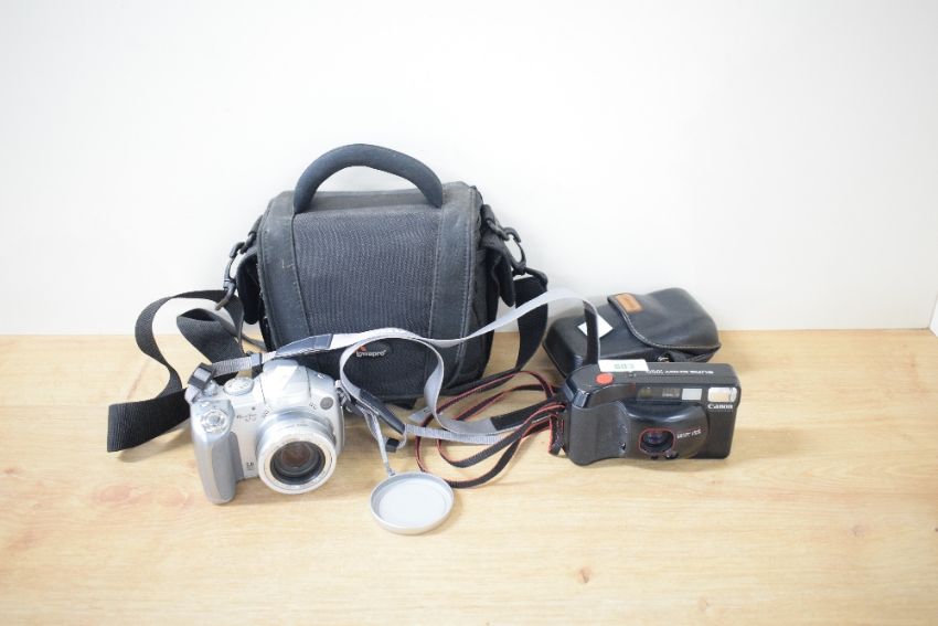 Canon Sure Shot Supreme 35mm camera with a Canon leather case and a Canon Powershot S2 IS digital camera with a Lowepro Edit 120 bag.