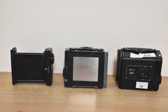 Two Bronica 220 film back for SQ-A 6x6 medium format camera. Sold alongside a 120 film holder insert.