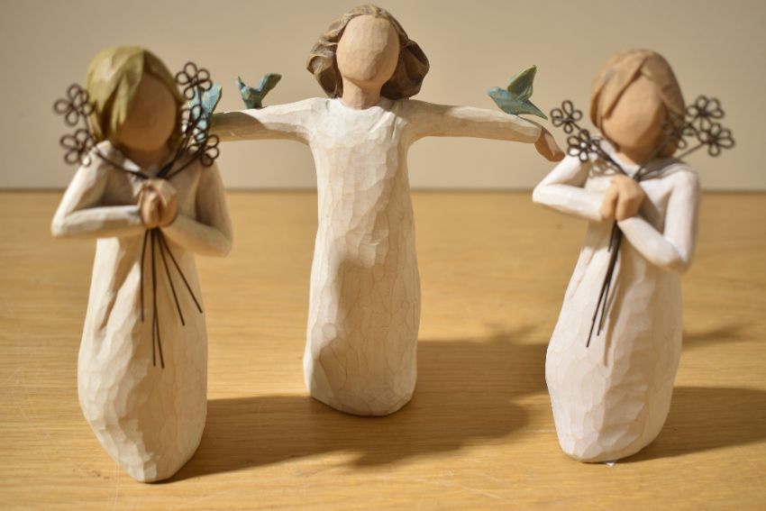 Three Willow Tree figurines including Friendship x2 and Happiness.