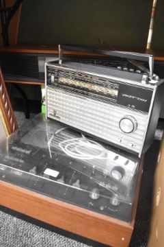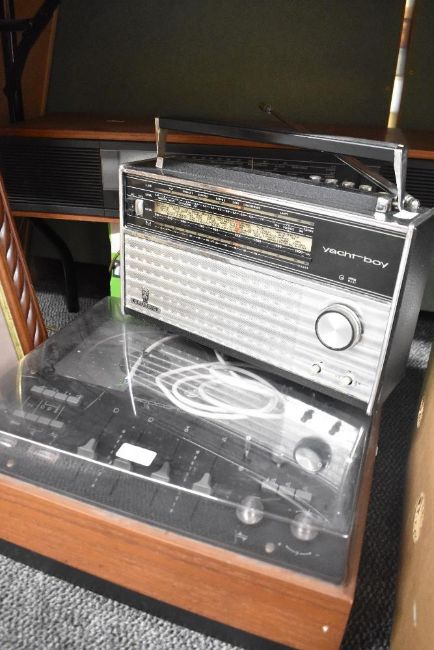 A vintage Bang and Olufsen Beocord 2000 reel to reel tape recorder, a rosewood Bang and Olufsen Beomaster 900 radio receiver and a Grundig Yachtboy radio.