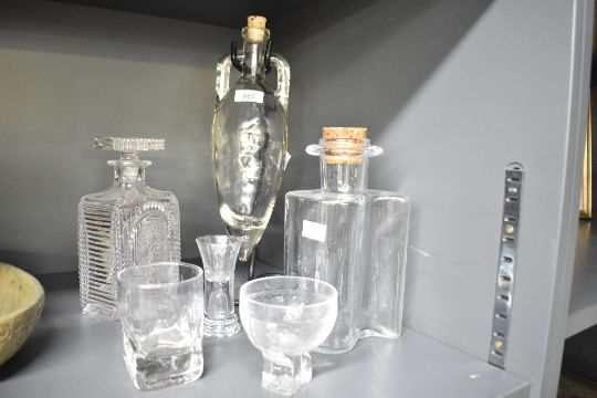 An Art Deco style decanter having cut glass geometric patterns, h22cm, sold together with 1 other decanter and a shot glass ect