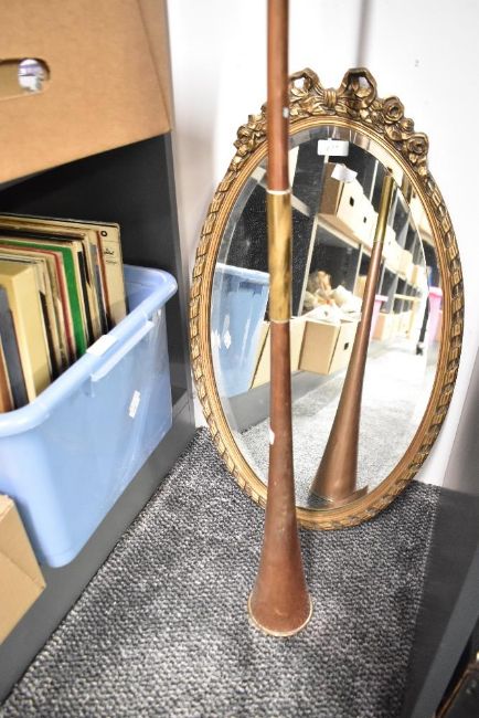 A 20th century copper and brass hunting horn, L120cm in damaged condition