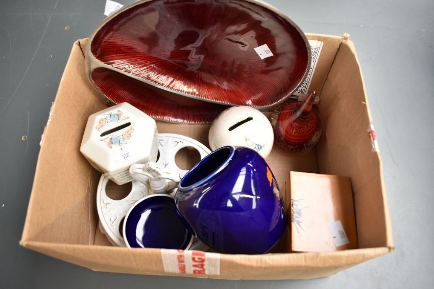 A decorative serving platter having painted red interior sold alongside two bone china money boxes one Royal Douton Bunnykins the other a Wedgwood Peter Rabbit etc.
