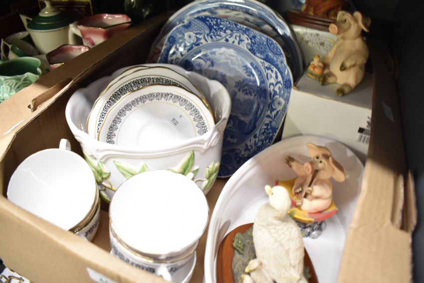 A Royal Grafton platter in the Dynasty pattern, a small selection of blue/pink and white ware including Copeland Italian, a pretty jardiniere in white and having an ivy design, a Royal Vale part tea service (18), a Piggin (piggin Weather) animal study in originl box, a Leonardo Duck Family study and a Country Life Design Studio bird study etc.