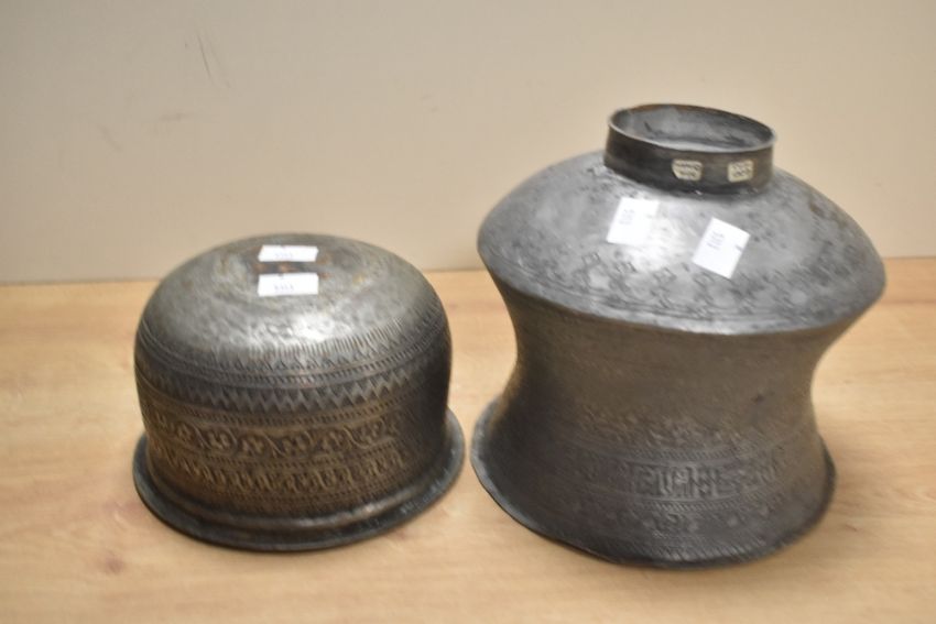 An antique Omani turned copper vessel, of traditional decorative design, sold together with a similar Jemani bowl, (2), signs of wear due to age.