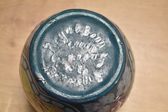 A 20th-century German Royal Bonn Ruysdael pottery vase, of orb form, featuring hand-painted green and orange flowering cactus decoration against a background of purple and green skies, pierced by a teal-coloured band of repeating oval shapes enclosing smaller pink flower motifs, 18cm.
