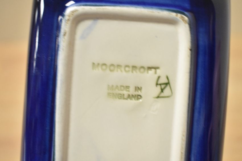 A 20th-century Moorcroft pottery Anemone pattern pen tray, featuring a dark cobalt blue background, which is adorned with two stylised flowers in red and purple colouring, spruced with green foliage, marked to base, 20cm.