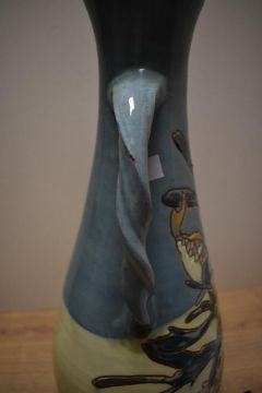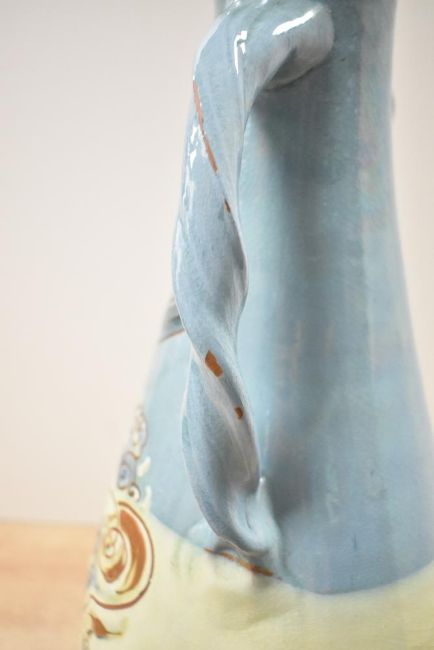 An attractive C.H. Brannam Barnstable Arts and Crafts vase, featuring a tall, tapered conical shape with a gently flared rim leading to a widening narrow base, decorated with colourful sgraffito fish amidst reeds, having two twisted handles, marked to base and dated 1895, 45 cm, slight ware to glazing on handles.
